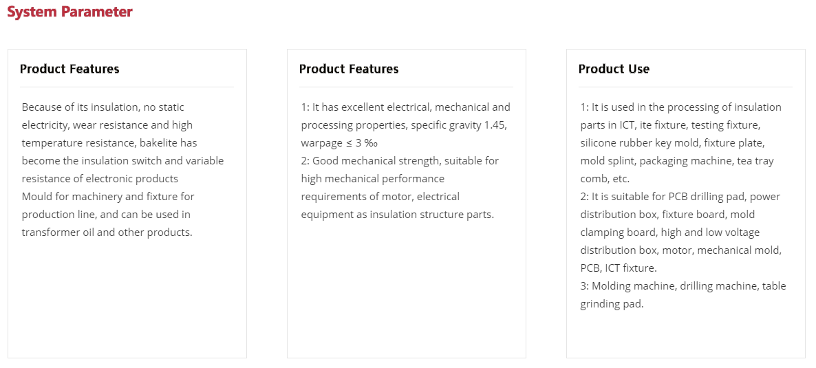 Because of its insulation, no static electricity, wear resistance and high temperature resistance, bakelite has become the insulation switch and variable resistance of electronic products, the mould for machinery and the fixture for production line, and can be used in transformer oil and other products. < br > < br > electric wood board, also known as glued wood board and phenolic laminated board, is made of insulating impregnated paper impregnated with phenolic resin, baked and hot pressed.